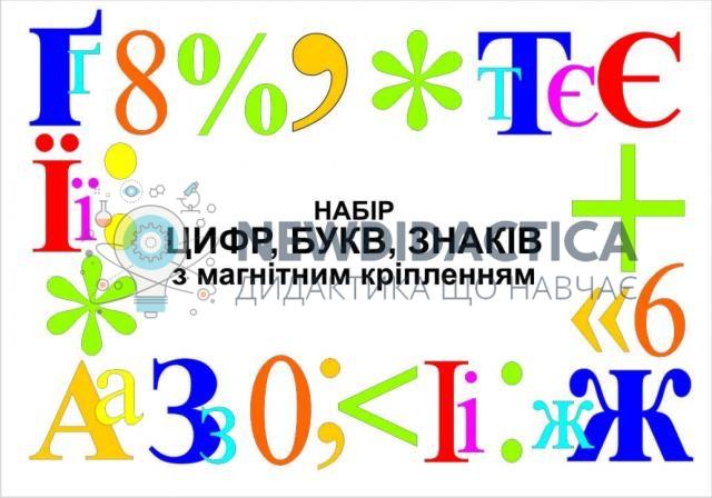Набір цифр, букв, знаків (ламінований, з магнітним кріпленням) використовується в якості демонстраційного матеріалу під час вивчення арифметики та української мови в початкових школах і дитячих садках. Набір складається з наступних карток: цифри 0-9 – 10 карток математичні знаки – 8 карток розділові знаки – 10 карток алфавіт – 33 картки апостроф – 1 картка.
