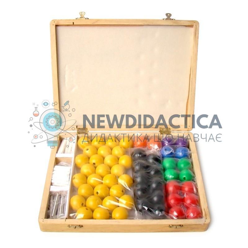 Для об’ємного моделювання молекул неорганічних і органічних сполук. Склад: кульки і кріплення. Моделі відображають просторове розміщення атомів у молекулах різних речовин і сприяють формуванню уявлень про форму молекули, ізомерію тощо. Моделі атомів повинні мати кольорове кодування