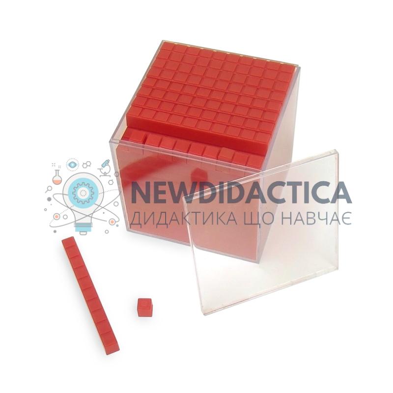 Модель призначена для демонстрації понять «одиниці об'єму», «об'єм прямокутного паралелепіпеда». Модель являє собою куб з некрихкого матеріалу зі стороною не менше 10 см, на грані якого нанесено сітку 1 х 1 см. Одна частина 1 х 10 (або більше) см може відокремлюватися для демонстрації, а від цієї частини може відокремлюватися куб 1 х 1 см.Склад набору:- кубики 1х1х1 см – 10 од.;- палички 1х1х10 см – 9 од.;- площини 1х10х10 см – 9 од.;- куб 10х10х10 см – 1 од.;- паспорт на виріб – 1 од.