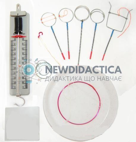 Набір для визначення поверхневого натягу рідини використовується в кабінеті фізики загальноосвітнього навчального закладу під час вивчення курсу молекулярної фізики і термодинаміки. Прилад дозволяє демонструвати поверхневий натяг рідини і вимірювати його силу, залежність коефіцієнта поверхневого натягу від температури та густини рідини. Сили, що діють усередині поверхневого шару, називають силами поверхневого натягу. Набір складається : рамка дротяна з рухливою щаблиною, до середини якої підв'язана нитка; кільце з ручкою- 5 шт.; динамометр; лоотк для рідини. Додатково рекомендується використовувати столик підйомний.