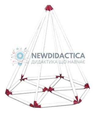 Комплектність Кожна зі сторін будь-якої моделі складається з трьох стрижнів, які утворюють ребро і входять один в одного за принципом телескопічної антени. Висока якість матеріалу укупі з зазначеною конструкцією ребер дозволяє з достатньою легкістю і чіткістю здійснювати необхідні маніпуляції зі зміни розмірів сторін. Місця стикування ребер, що знаходяться у вершинах і підставках геометричних тіл, з'єднання єднані за допомогою оригінального кільця, що, фактично, з необмеженим ступенем свободи дозволяє обертати стрижні, змінюючи довжини сторін. Така рухливість частин дозволяє отримати з однієї моделі різні нові моделі і фігури, як стандартні, так і нестандартні. Необхідно також відзначити, що знімний характер вузлових (вершинних) деталей дає можливість, змінюючи кількість сторін при кожній вершині віхідної фігури, відкрити шлях до пошуку нових геометричних фігур. Склад - трикутна піраміда - чотирикутна піраміда - п'ятдесят ятикутна піраміда - конус - циліндр - три додаткових стрижня для побудови перетинів