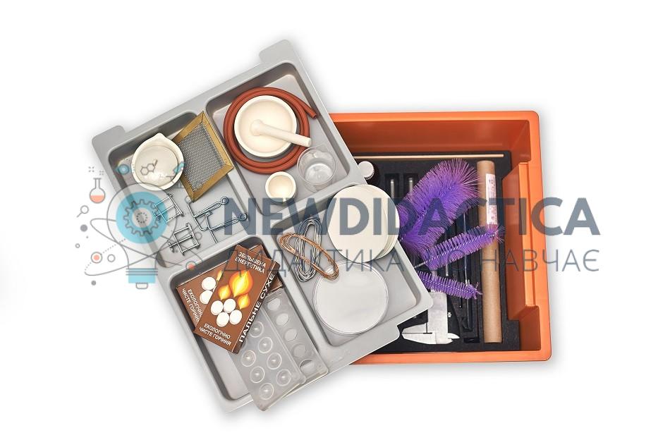 Використовують набір шкільний лабораторний (НШЛФ) в кабінеті фізики загальноосвітнього навчального закладу під час проведення лабораторних дослідів. Набір містить повний комплект необхідного лабораторного посуду, інструментів та матеріалів для проведення лабораторних робіт відповідно до діючих навчальних планів та програм. Склад: термометр рідинний (-10ºC… +100ºC) – 1шт.; колба конічна 50 мл – 1 шт.; колба плоскодонна 50 мл – 1 шт.; колба круглодонна 50 мл – 1 шт.; склянка для зберігання речовин 50 мл – 2 шт.; склянка для зберігання речовин 20 мл – 6 шт.; стакан хімічний ПП 50 мл – 1 шт.; стаканчик скляний 50 мл – 1 шт.; пробірка ПХ14 – 15шт.; пробірка ПХ21 – 2 шт.; штатив для пробірок на 10 гнізд – 1 шт.; чашка Петрі ПП – 1 шт.; чаша випарювальна 25 мл – 1 шт.; тигель кераміничний 18 мл з кришкою – 1 шт.; ложка для спалювання речовин – 1 шт.; тримач для пробірок – 1 шт; затискач Гофмана (гвинтовий)20 мм – 2 шт.; затискач Мора (пружинний) 70 мм – 2 шт.; паличка скляна 180 мм – 2 шт.; шланг гумовий з’єднувальний (діаметр-5 мм, мед. трубака тип 6) – 1 шт.; лійка конічна 36x50 – 1 шт.; папір фільтрувальний – 5 шт.; піпетка-дозатор, 6 мл, пп – 1 шт.; піпетка-дозатор, 3 мл ,пп – 1 шт.; сухе паливо (таблетки) – 2 шт.; сітка латунна розпилювальна – 1 шт.; йорж для миття посуду, різного діаметру – 3 шт.; рукавички латексні – 5 шт.; ступка фарфорова 160 мм, з товкачиком – 1 шт.; лінійка мірна, 30 см – 1 шт.; штангельциркуль,1-125-0,1 – 1 шт.; проволка мідна, 2м – 2 шт.; припой - 1 шт.; лоток для зберігання набору – 1 шт.; пакувальна коробка – 1 шт.