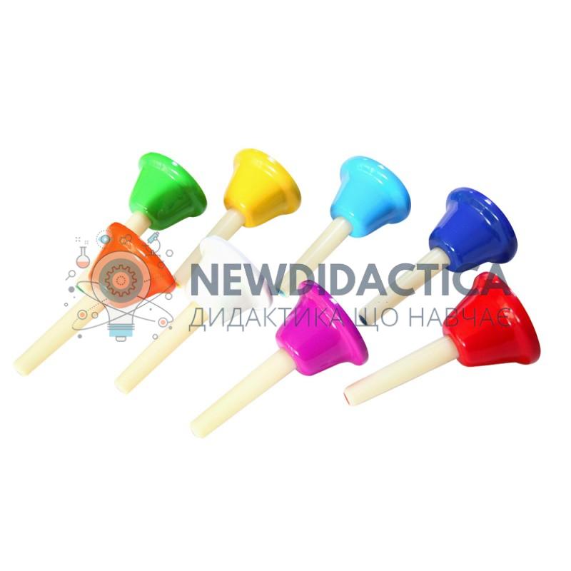 Виготовлено з металу та пластику, пофарбовано в яскраві контрастні кольори.   Склад набоу: Дзвіночки музичні 8 нот, що відповідають окремій ноті звучання, набір з не менше ніж 8 шт. Кожен окремий дзвіночок певного кольору, має свою тональність і маркування.