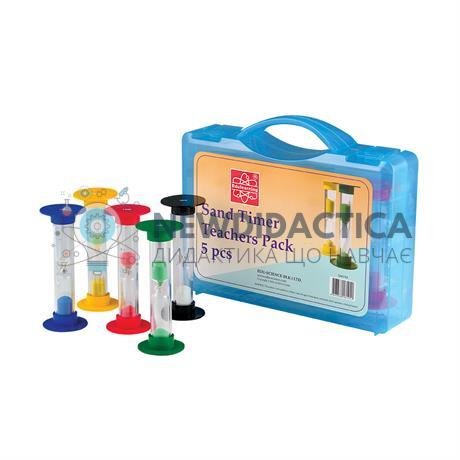 Піскові годинники для вчителя містить 5 штук піскових годинників різних кольорів із відліком часу: червоний 10 хвилин, зелений 5 хвилин, жовтий 3 хвилини, синій 1 хвилина, чорний 30 секунд.