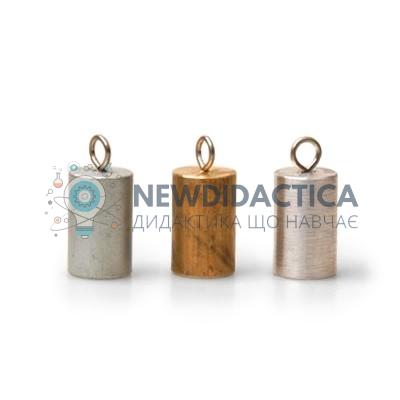 Використовується набір тіл з калориметрії в кабінеті фізики загальноосвітнього навчального закладу та призначений для проведення лабораторних робіт з вивчення густини, питомої теплоємності речовини, об’єму та маси тіла. Тіла оснащені гачками. Розмір циліндрів дозволяє використовувати стандартний мірний посуд під час проведення лабораторних робіт. Технічна характеристика: сталевий циліндр (діаметр 20 мм, висота 30 мм, маса 72 г) – 1 шт.; латунний циліндр (діаметр 20 мм, висота 30 мм, маса 78 г) – 1 шт.; алюмінієвий циліндр (діаметр 20 мм, висота 30 мм, маса 26 г) – 1 шт.