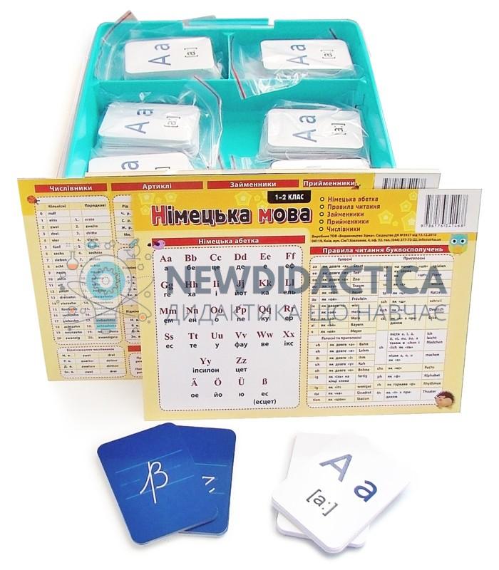 - картки демонстраційні зі зразками друкованих літер (великих та малих) сучасної німецької мови. Формат А5, матеріал - цупкий картон на магнітній основі, кількість - не менше 30 од.;