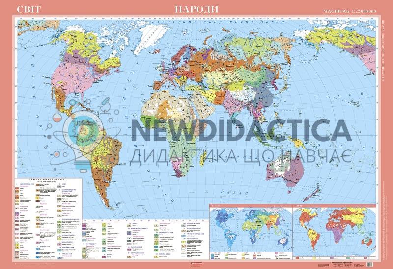 Опис товару: Карта для використання на уроках географії В сучасному навчальному процесі важливе місце посідає візуальна складова подачі інформації. Використання карт на уроках географії є незамінним інструментом, що спрощує розуміння і сприйняття теми, яку пояснює вчитель. Особливості даної карти Карта народів світу відображає місця проживання та особливості розселення народів в різних країнах та на різних континентах. Яскрава, деталізована, виготовлена на якісній щільній основі, додатково укріплена планками – зверху і знизу – вона розрахована на тривалий термін експлуатації. Масштаб карти - 1:22 000 000