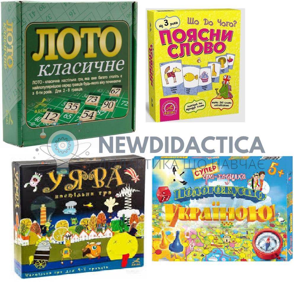 Використовується у початкових класах загальноосвітнього навчального закладу. Призначення: використання ігор в навчальному процесі допомагає активізувати діяльність дитини, розвиває пізнавальну активність, спостережливість, увагу, пам’ять, мислення, підтримує інтерес до того, що вивчається, розвиває творчу уяву, образне мислення, знімає стомлення у дітей, оскілька гра робить процес навчання цікавим для дитини. Склад набору: - гра “Подорож Україною” - 1 од.; - гра “Поясни слово” - 1 од. - гра “Уява” - 1 од.; - гра “Лото класичне” - 1 од.