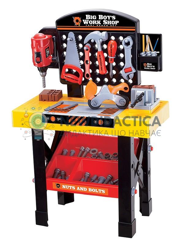 Комплект містить 46 елементів, серед яких: молоток, викрутка, викрутка, плоскогубці, пила, пластикові шурупи та цвяхи, дошки з отворами, лещата, болти, гайки, шурупи тощо.