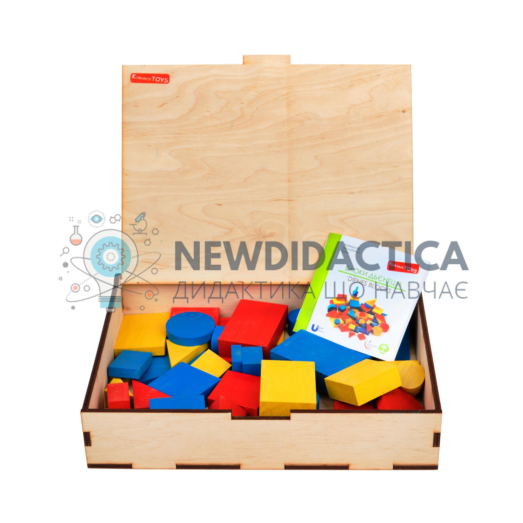 Набір логічних блоків Дьєнеша – ефективний дидактичний матеріал, що добре поєдує в собі елементи конструктора та розвиваючої гри. Набір складається з 48 об’ємних геометричних фігур, що різняться по кольору(синій, жовтий, червоний), формі (трикутний, прямокутний, круглий, квадратний), розміру (великий, малий) та товщині (товтий, тонкий). Кожна фігура наділена чотирьма якостями. Основна ціль – навчити дитину вирішувати логічні задачі на розбиття по якостям. Блоки пропонують безкінечну кількість ігор, що можливо видумувати і самим. Фігури набору пофарбовані в яскраві кольори, деталі добре відшліфовані. Виготовлено з твердої породи дерева. Упаковано в зручний пластиковий контейнер для зберігання.