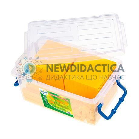 Набір можна використовувати для навчання десяткових систем, розуміння площі та об`єму. Деталі можна з`єднувати між собою. Кожен набір упакований у пластиковий контейнер із кришкою. Продукція відповідає концепції Нової української школи та має свідоцтво про відповідність педагогічним вимогам МОН України.