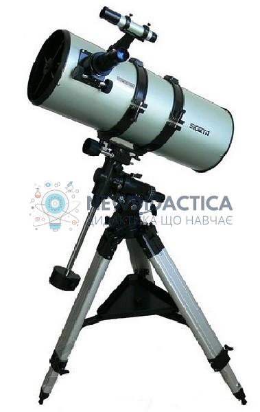 Характеристики: Діаметр, мм: 150 Фокус, мм: 1400 Збільшення (МП): 406 Світлосила: 4 Дозволене збільшення: 284 Мінімальне збільшення: 29 Проникаюча здатність: 14 Роздільна здатність, кут.сек: 0,56 Конструкція: Тип: рефлектор Ньютона Зображення: повністю пряме Фокусер: 2 "рейковий (метал) Монтування: екваторіальне Авто: можлива установка Комплектація: Оптична труба Екваторіальна монтування Алюмінієва тринога Шукач оптичний 6х30 Окуляр 25мм, 1,25'' Окуляр 6,5мм, 1,25'' Лінза Барлоу 2х, 1,25'' Обертаюча лінза 1,5х Місячний фільтр 1, 25'' Вага: 21 кг