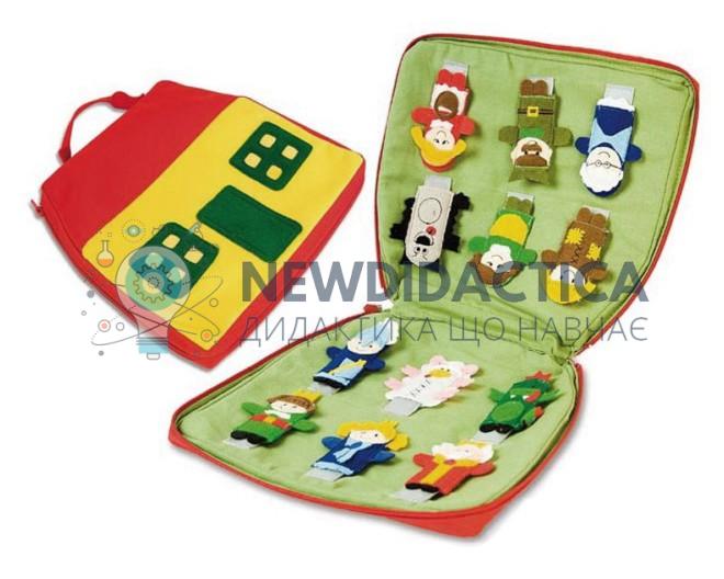 Набір із 12 пальчикових ляльок у зручній сумці з ручкою для перенесення та зберігання. Будиночки та ляльки виготовлені із кольорового фетру. Дитина легко одягне ляльку на палець і приведе персонажів у рух рухом руки. Будинок дозволяє легко підтримувати порядок серед маріонеток.