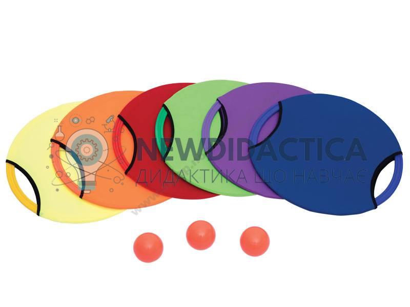Набір міні-батутів, які використовуються для підстрибування та прийому м’ячів. Оснащений гнучким матеріалом та зручними ручками, що полегшують утримання та маневрування. Обладнання забезпечує командні ігри та ігри у спортзалах, а також на відкритому повітрі. 9 елементів: 6 міні-батутів oV Е ›r. 40 см в 6 кольорах: темно-синій, фіолетовий, червоний, оранжевий, зелений, жовтий, 3 намистини. 7 см оранжевого кольору; матеріал; Пластикові; вік: 6+