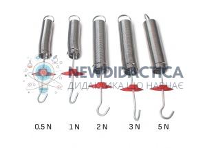 Набір пружин різної жорсткості використовуються в кабінеті фізики загальноосвітнього навчального закладу під час проведення лабораторних робіт з механіки. Кожна пружина оснащена стрілкою- фіксатором червоного кольору, який можна пресувати вздовж стержня з гачком та фіксувати у необхідному (нульовому) положенні. Характеристики пружин наведені в таблиці. Пружина № Довжина намотування витків, мм Діаметр витка, мм Жорсткість пружини, н/м 1 75 20 25 2 71 19 15 3 71 19 10 4 62 15 5 5 47 15 2,5 Комплектація: Набір містить 5 пружин: 0,5N; 1N; 2N; 3N; 5N. Габаритні розміри набору в упаковці: 150х100х20 мм.