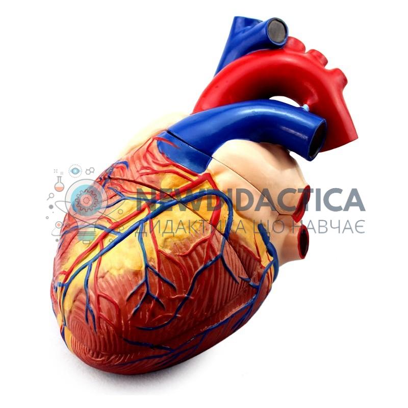 Використовується модель «Серце людини» в кабінеті біології загальноосвітнього навчального закладу під час вивчення розділу «Людина», теми «Кровоносна система». Модель є розбірною, детально демонструє анатомію серця з шлуночками, з передсердями, веною і аортою. Передня стінка знімна. Коронарні артерії і вени позначені кольором. Виготовлена з пластика, забарвлена в яскраві природні кольори та встановлена на підставку. Розміри моделі приблизно 35 см.
