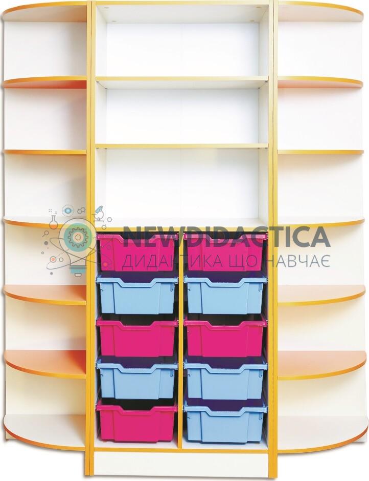 Габаритні розміри – 1520х440х1864 мм Конструктивні складові: кришки верхні і нижні, боковини і полиці виготовлені з ламінованого кольорового ДСП товщиною 16мм, класу емісії Е1, обклеєної по торцях протиударною кромкою ПВХ товщиною 0.45 мм. Шафа складається: 1. Шафи (80468) що комплектується пластиковими шухлядами розміром 310х380х150 мм (10шт). Шухляди встановлені на спеціальних направляючих. 2. Двох кутових стелажів (80464) – 415х415х1864 Шафа відповідає вимогам ДСТУ ГОСТ 22046:2004 “Меблі для навчальних закладів. Технічні умови”.