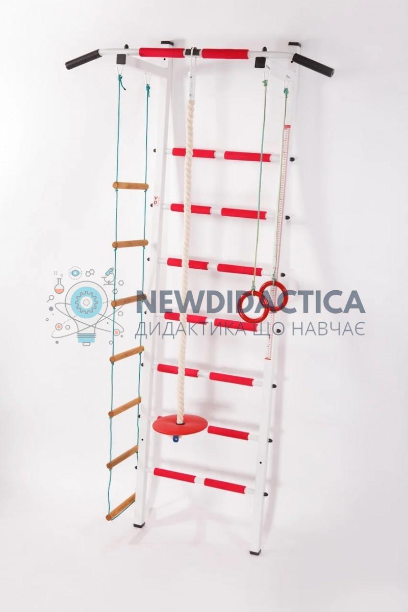 Комплектація Шведської стінки VD Юнона: шведська стінка з металевими перекладинами з неопреновими накладками зі стаціонарним турніком з широким хватом (консолі турніка приварені до стійок шведської стінки) дитячий навісний набір з 5 предметів: канат (або диск-тарзанка), кільця, мотузкові сходи, гімнастична трапеція, дитячий навісний турнік кронштейни кріплення до стіни (4 шт), верхні і нижні штока для розпору «підлога-стеля» зростомір. Шведська стінка VD Юнона комплектується двома видами кріплення: кріплення в розпір пів-стеля і кріплення до стіни. Кріплення в розпір «підлога-стеля» проводиться за допомогою нижніх розпірних і верхніх штоків. Висота приміщення при такому кріпленні повинна знаходиться в межах 2,45 – 2,85 м. При висоті понад 2,85 м можна замовити подовжені верхні штока (максимальна висота приміщення для кріплення пів-стеля 3,10 м). Кріплення до стіни використовується в приміщенні висотою не нижче 2,35 м і проводиться 4 виносними кронштейнами, в кожному з яких по 2 точки кріплення. Всього 8 точок кріплення. Для кріплення до стіни необхідні анкери або дюбель діаметром 10 мм і довжиною від 70 мм. Анкера в комплектацію не входять. Зазвичай використовують один з видів кріплення (або в розпір, або кріплення до стіни). Розміри Шведської стінки VD Юнона: висота – 2,27 м, ширина – 0,66 м, ширина турніка – 1,12 м, виліт турніка – 0,42 м (від стійки шведської стінки), довжина кроштейна кріплення до стіни 12 см. Максимальна вага користувача – 120 кг. Колір: метал – білий, накладки - червоні, сині.