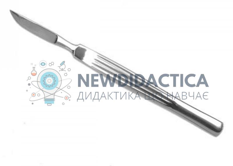 Скальпель використовується в кабінеті фізики та біології загальноосвітнього навчального закладу під час проведення демонстраційних та лабораторних дослідів. Виготовлений з нержавіючої сталі або пластмаси зі змінними стальними лезами. Технічна характеристика: Скальпель (нержавіюча сталь): вага - 0,02кг, габаритні розміри - 150х12х2мм.Скальпель (пластик): вага - 0,006кг, габаритні розміри - 150х12х2мм.