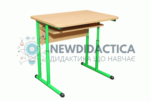 Стіл учнівський 1-місний з полицею, регулюється на ростові групи № 4-6 Габаритні розміри: 700х500х640-760 мм. Вага: 12,7 кг. Каркас – кругла металева труба d25/d32 мм, покриття нанесене напиленням порошкових полімерних матеріалів. Стільниця із заокругленими кутами, виготовлена із ламінованої ДСП товщиною 18 мм, ПВХ - 1 мм, екран та полиця - з ДСП ламінованої товщиною 16 мм. На каркасі присутнє маркування ростових груп при регулюванні висоти столу. Колір ДСП: бук, дуб молочний. Колір каркасу: салатовий (RAL6018) або сірий (RAL7035).