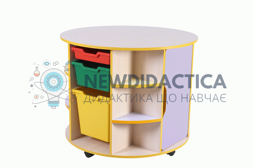 Стіл «Осередок творчості учня» (ціна указана з лотками як зображено на фото) Габаритні розміри: 900х900х750 мм. Вага: 53 кг. Стіл «Осередок творчості учня», призначений для обладнання навчальних приміщень. Габаритні розміри: ширина – 900 мм; глибина – 900 мм; висота – 750 мм. Стіл «Осередок творчості учня» складається з: Стійки – ДСП ламінована 16 мм; колір - дуб молочний. Стільниця, дно – ДСП ламінована 16 мм; колір - дуб молочний. Полиці – ДСП ламінована 16 мм; колір - жасмін/лаванда. Двері – ДСП ламінована 18 мм; колір - жасмін/лаванда. Вкладні ящики – пластмаса. Деревинні деталі столу із ДСП ламінованої товщиною 16 мм, а двері із ДСП ламінованої товщиною 18 мм личкуються ПВХ товщиною 1 мм. Кріпильні вироби мають захисне декоративне покриття. Установлений на коліщата. Колір корпусу: дуб молочний, жасмін, лаванда.