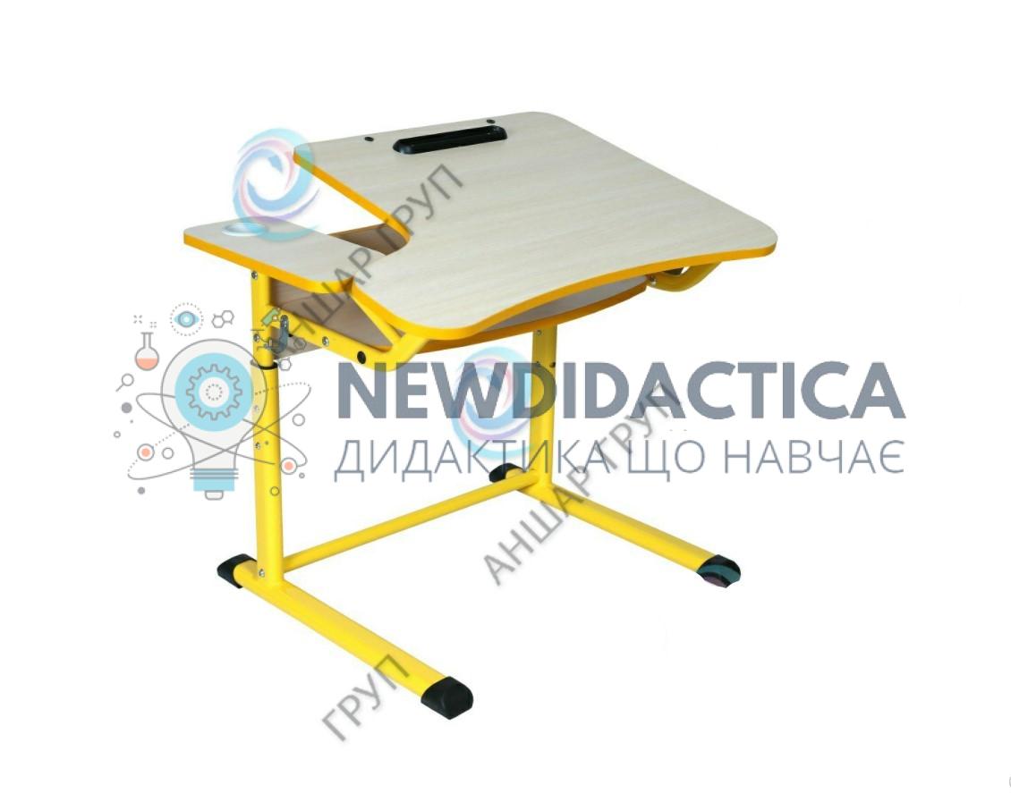 Велика частина стільниці має антисколіозний виріз та може встановлюватися як під кутом так і горизонтально. Кути нахилу стільниці: 0°, 3°, 5°, 7°, 9°, 12°, 14°, 16°. Регулювання кута нахилу стільниці здійснюється за рахунок механізму, типу ростомата, з обов’язковою наявністю обмежувачів для безпеки використання учнями. Обмежувач являє собою зажимний механізм зі зручною пластиковою ручкою, що блокує самовільну зміну кута нахилу стільниці. На великій частині стільниці розміщений пластиковий пенал для приладдя та отвори для тримача книг.