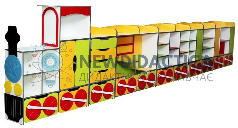Фасади оздоблені тематичними МДФ накладками червоного, жовтого, синього та чорного кольорів.