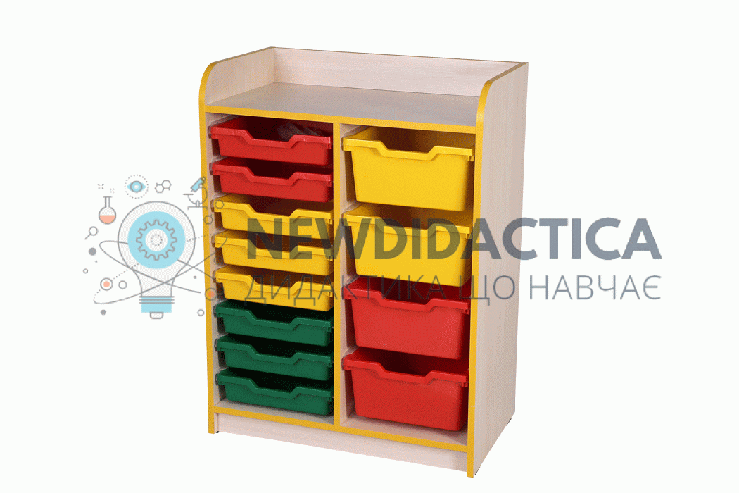 Габаритні розміри: 696х410х936 мм. Вага: 21.50 кг. Тумба 2-секційна. Кожна секція може комплектуватись пластиковими лотками Gratnells різного розміру N1, N2. Виготовлена з ДСП 16 мм. Задня стінка виготовлена з білої ламінованої ДВП товщиною 3 мм. Оклейка: ПВХ жовтого кольору товщиною 1 мм. Колір корпусу: бук або дуб молочний.