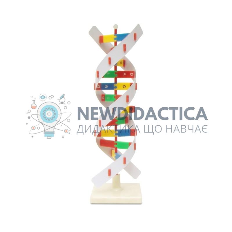 Використовується модель «Структура ДНК» в кабінеті біології загальноосвітнього навчального закладу під час вивчення розділу «Загальна біологія», теми «Основи цитології. Нуклеїнові кислоти». Модель є розбірною, демонструє будову подвійної спіралі дезоксирибонуклеїнової кислоти (ДНК) та її елементи: моносахариди, залишки фосфорної кислоти та чотири типи основ: аденін, тимін, гуанін, цитозин. Елементи моделі забарвлені в умовні кольори. Виготовлена з пластика та встановлена на підставку. Розмір моделі приблизно 50 см.