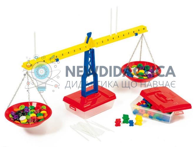 Призначені для використання на уроках математики в початковій школі в якості демонстраційного матеріалу для вивчення тем «Більше – менше», «Важче – легше», «Одиниці вимірювання величин та співвідношеннями між ними». Матеріал - високоякісний кольоровий пластик. Склад набору: - терези - 1 од.; - коробка для зберігання важків, кілець та паличок - не менше 2 од.; - шалька - не менше 2 од.; - важки у вигляді фігурок тварин - не менше 48 од.; - кільця - не менше 100 од.; - палички для тримання кілець - не менше 20 од.