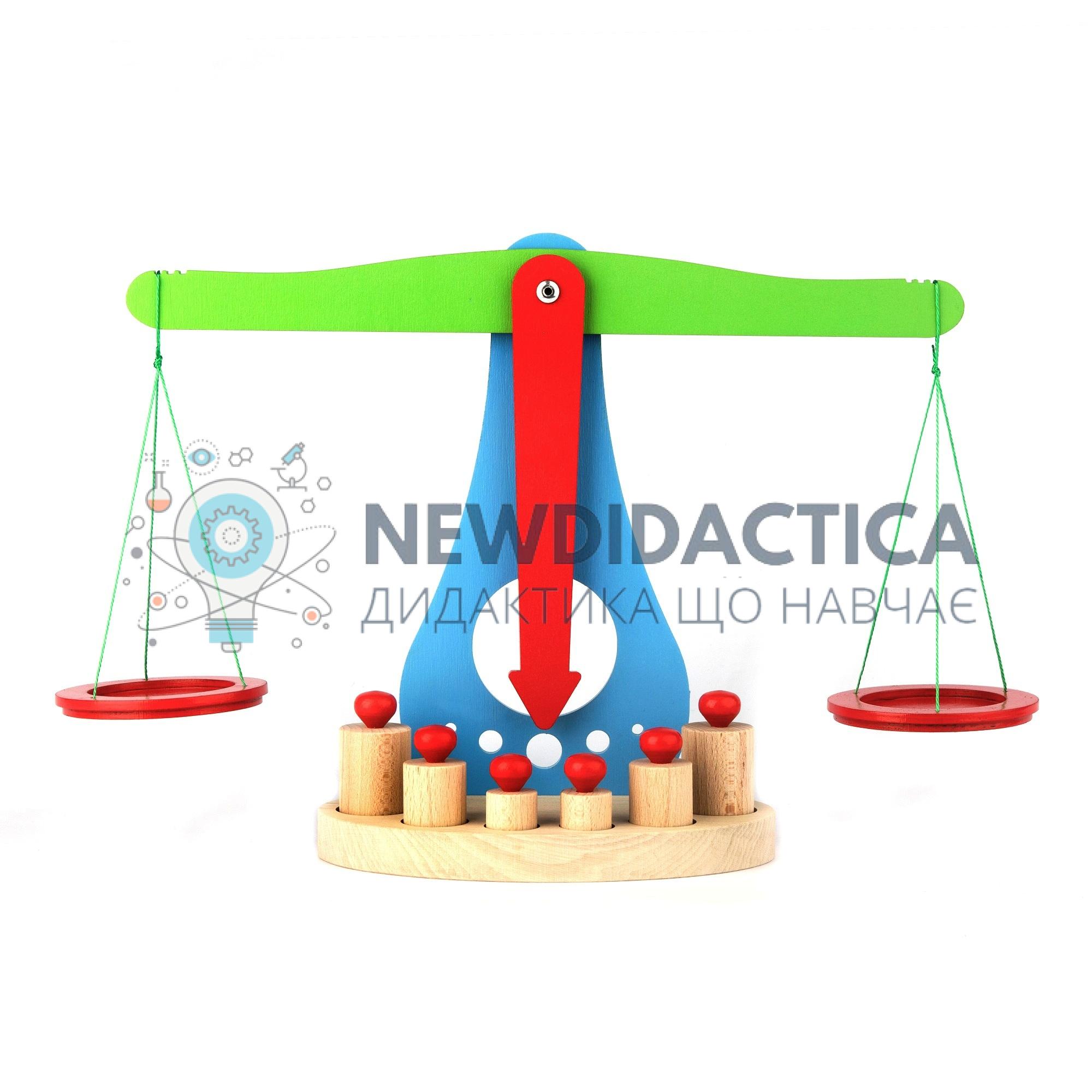 Терези навчальні застосовуються для вивчення принципу дії терезів, зважування маси предмету, співвідношення ваги і величини предметів, освоєння поняття «більше-меньше», «легше-важче», координації рухів. Розвивають логіку, увагу. Допомагають в подальшому швидше вивчити принцип дії повнорозмірних аналогів. Виготовлені з дерева та пофарбовані якісними, яскравими, європейськими фарбами на водній основі. Розмір в зібраному вигляді : 400х250х120мм.