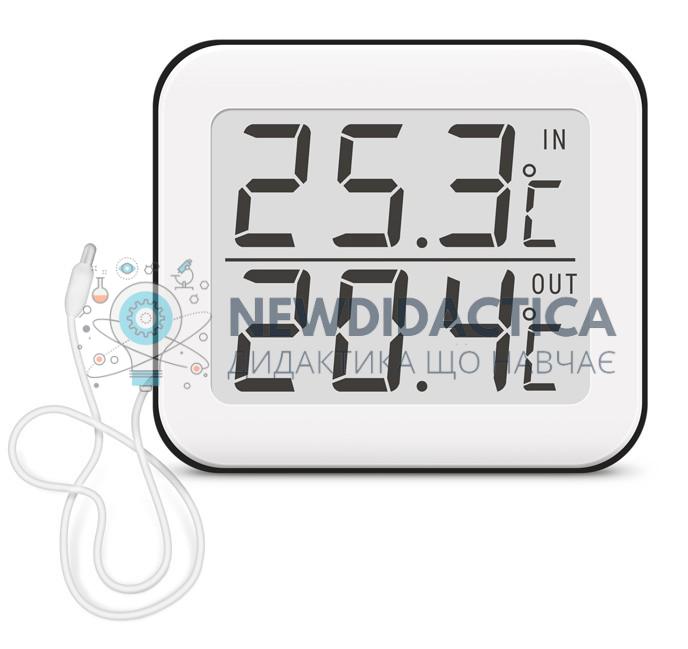 Цифровий термометр, з виносним датчиком. Відстань від індикатора до цифрового табло (не менше) - 1,5м. Дає можливість виміряти температуру, як у приміщені, на вулиці, інших, закритих, резервуарах: акваріум, морозильна камера, тощо. Технічні характеристики: діапазон виміру температур: −40 ÷ +70°C.; ціна поділки шкали: 1°С.; матеріал корпуса: пластик; особливості використання: Розміщення на горизонтальній та вертикальній поверхні.