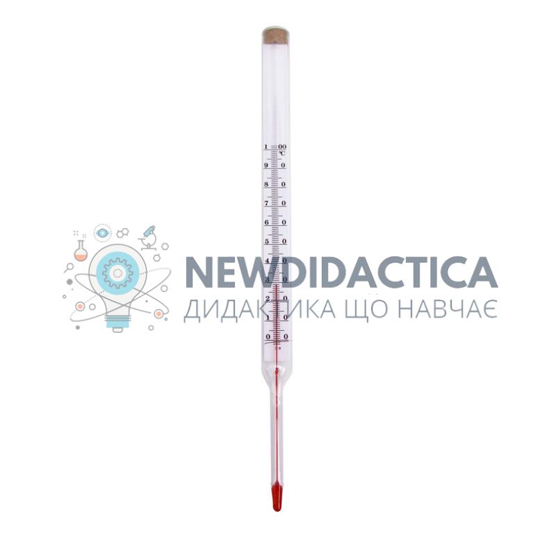 Використовується термометр рідинний 0…+100 ºС в кабінетах фізики, хімії, біології загальноосвітнього навчального закладу для проведення демонстраційних та лабораторних дослідів. Ціна поділки 1 ºС, довжина термометра 180 мм.Спиртовий.