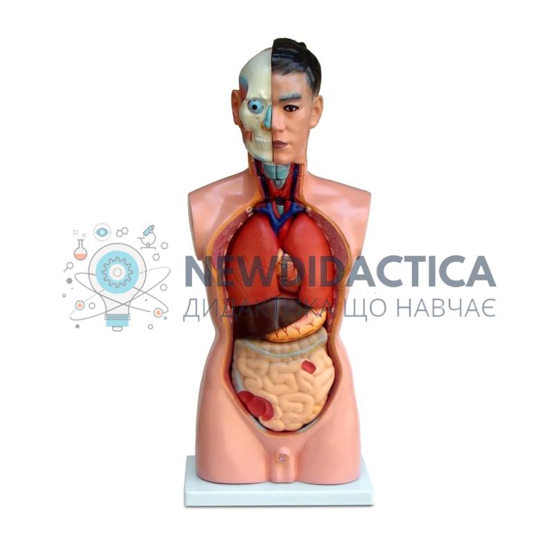 Використовується модель «Торс людини» в кабінеті біології загальноосвітнього навчального закладу під час вивчення розділу «Людина». Розбірна модель виготовлена з пластмаси та забарвлена в природні кольори. Модель є розбірною, демонструє торс людини з розкритою грудиною, що містить серце, легені, відділи травної системи, печінку, нирки, а також демонструє сагітальний розріз голови. Виготовлена з пластика та забарвлена в яскраві природні кольори. Висота моделі – 45 см.