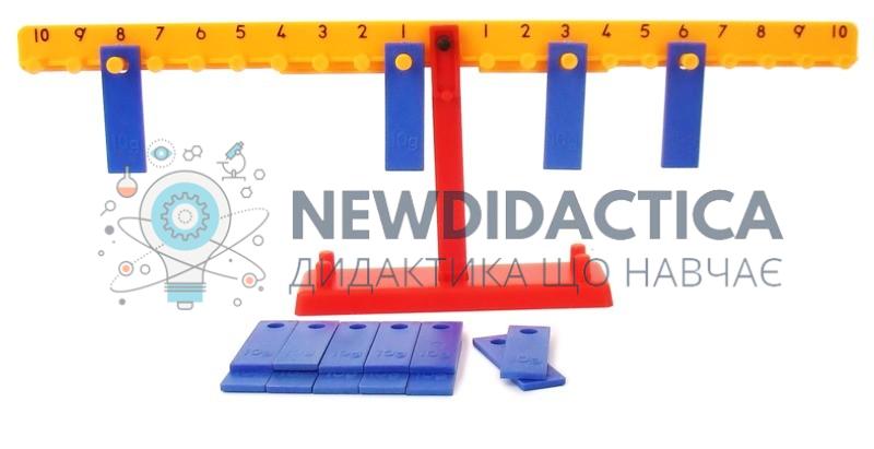 Використовуються у початкових класах загальноосвітнього навчального закладу для вивчення тем «Більше – менше», «Важче – легше», «Одиниці вимірювання величин та співвідношеннями між ними». Виготовлені з різнокольорової пластмаси. Балансування здійснюється за допомогою набору пластикових важків вагою 10 грам. Висота вагів становить 21 см, довжина – 62 см. Склад: ваги математичні демонстраційні – 1 од.; пластикові важки – 20 од. паспорт на виріб - 1 од.