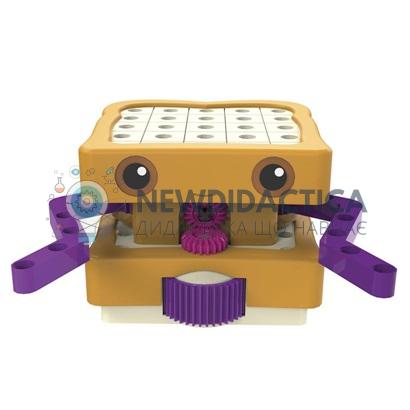 Склад набору: 417 елементів у тому числі кодові картки і картографічні картки:поля-килимки 116 од. деталей, 14 компл. наліпок і карток (кодові картки і картографічні картки), 1 базовий блок,заглушка стрижня-14 од, штифти-56 од, шестерні-9 од, вісь різна 4 од,кубічний блок (різні кольори)-75 од,трикутний блок (різні кольори) -14 од, випуклий блок (різні кольри)-86 од,віігнутий блок (помаранчовий,білий,синій)-13 од.,розподілович деталей-1 од,квадратнйи корпус-4од, базова частина робота--7 од,3 од. батарейок. Основні деталі набору вироблені з пластику, килимим з цупкого картону з спец. кольоровими зображеннями, наявність методичного посібника та плану уроку. Цей набір призначений для того, щоб діти навчалися основним принципам програмування у веселій, інтерактивній та експериментальній формі. За допомогою набору діти побачать вплив різних кодів та алгоритмів на поведінку робота. 30 уроків узгоджуються зі стандартами з інформатики. Уроки охоплюють шість основних ключових областей кодування: послідовність, цикли, події, умови, функції та змінні. Функціонально має можливість запису прогами,запуску прпограми,перезапису,стирання,музічного супроводу. Набір призначений для дітей 4-8 років.