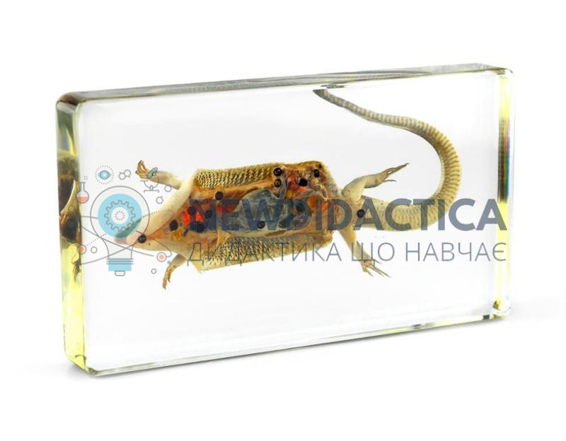 Використовується вологий препарат «Внутрішня будова ящірки» в кабінеті біології загальноосвітнього навчального закладу під час вивчення розділу «Tварини» та призначений для демонстрації зовнішнього та внутрішнього вигляду біологічного об’єкта. Габаритні розміри 190x105x28 мм, вага 0,67 кг.